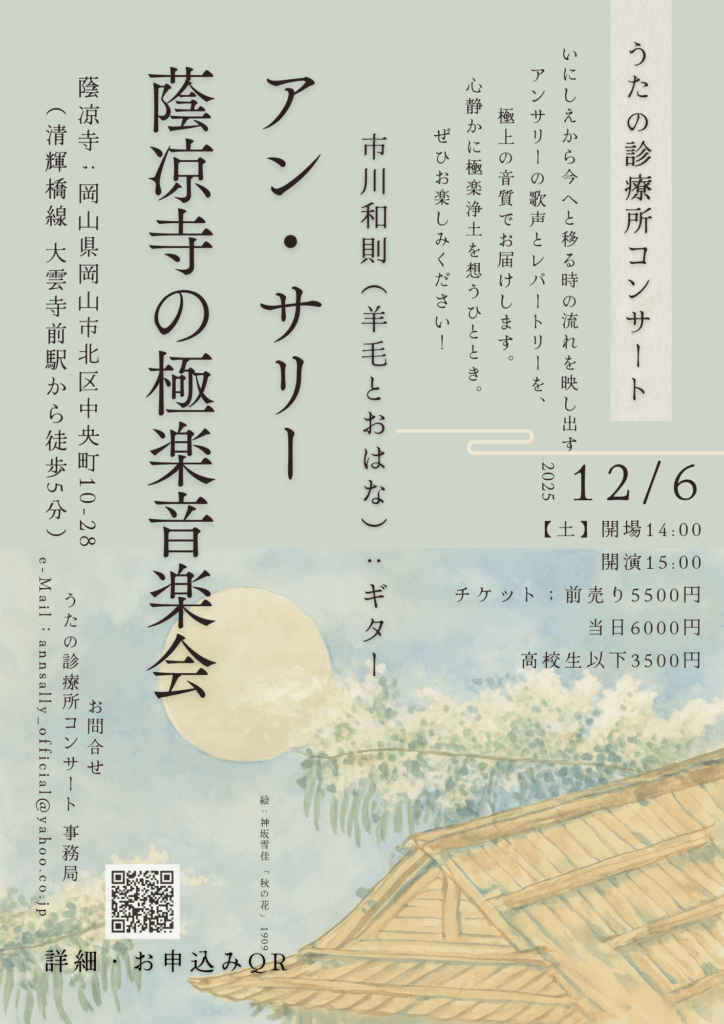音楽愛の溢れる蔭凉寺常設の、素晴らしいサウンドシステムをご住職自身によりエンジニアリング頂く貴重なコンサート。いにしえから今へと移る時の流れを映し出すアンサリーの歌声とレパートリーを、極上の音質でお届けします。師走の慌ただしさを忘れ心静かに極楽浄土を想うひととき。ぜひお楽しみください!